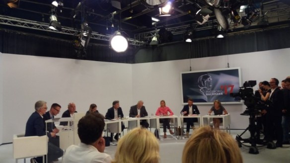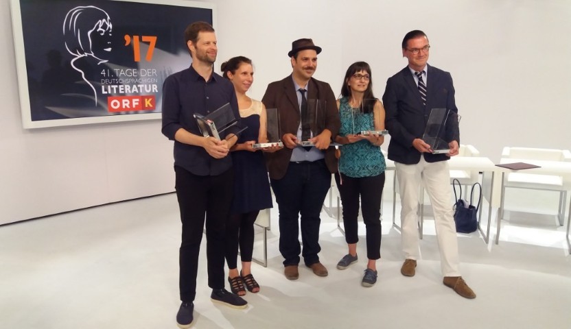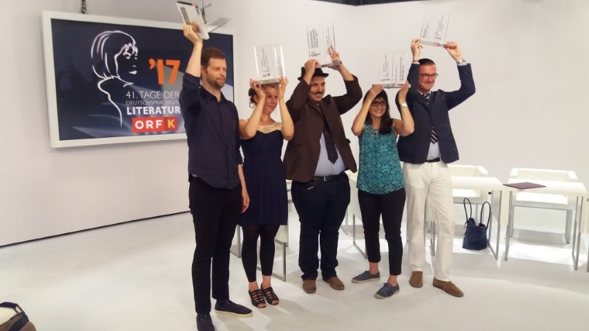 Preisverleihung 2017 _ Karin Peschka, Zweite von rechts, BKS Publikumspreis; weiter von links – John Wray – Deutschlandfunkpreis; Gianna Molinari – 3sat Preis; Ferdinand Schmalz – Bachmannpreis 2017; Eckhart Nickel – Kelag Preis; Preisverleihung ORF Studio Klagenfurt 9.7.2017.