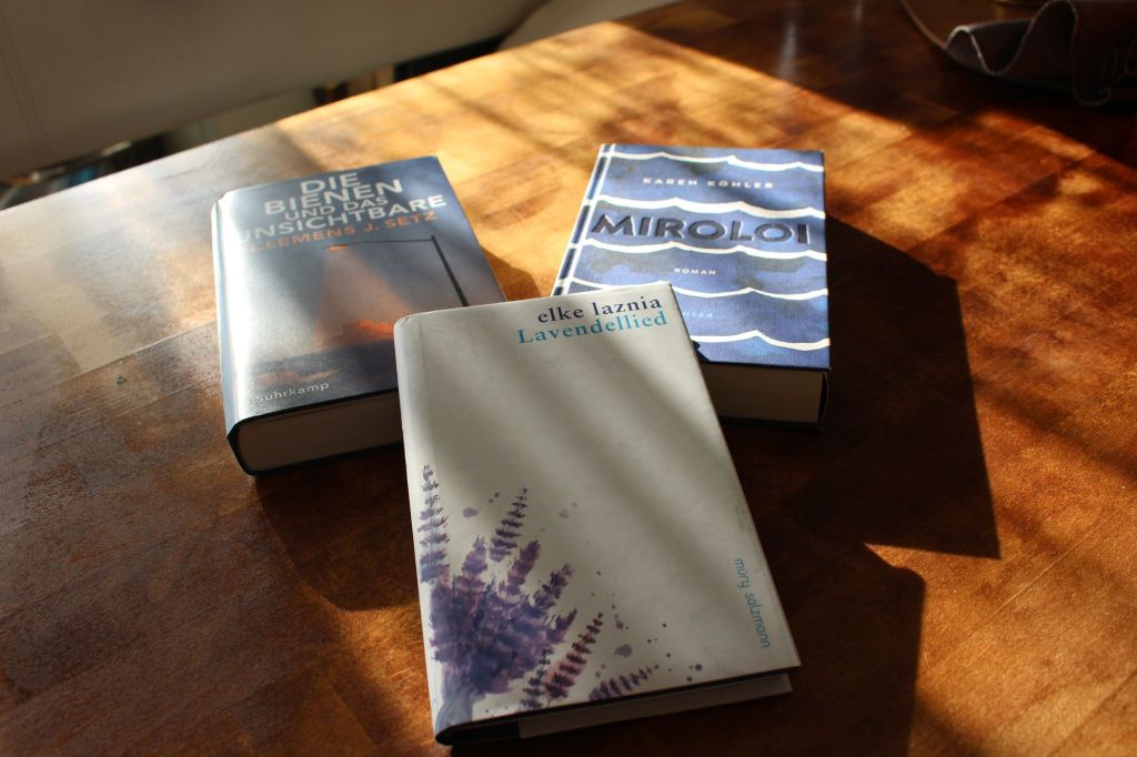 Ach. Das ist eine erbauliche Frage! Auf meinem Tisch liegen immer fünf bis sieben Bücher; derzeit gibt es drei, denen ich mich regelmäßig zuwende – „Miroloi“ von Karen Köhler. „Die Bienen und das Unsichtbare“ von Clemens J. Setz. „Lavendellied“ von Elke Laznia.