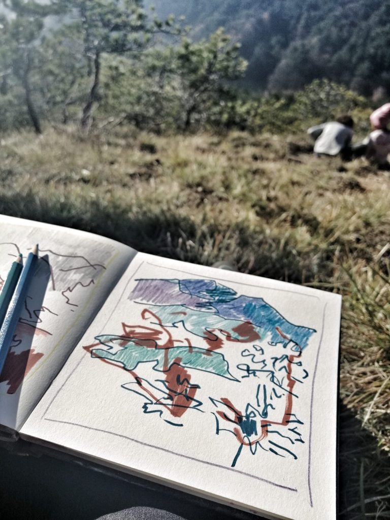 Wirrwarr prägt meinen Tagesablauf, eine sich konstant ändernde Routine. Wir haben zwei Schulkinder und ein Kindergartenkind. Durch die Schule vorgegebene Fixpunkte sind einmal da, dann wieder weg. Wir jonglieren mit sich laufend ändernden Rahmenbedingungen. Die Herausforderung für mich ist, Prioritäten so zu setzen, dass sich alle Termine, Aufgaben, Wünsche und Bedürfnisse vereinbaren lassen und ich dabei auch genug Zeit für meine kreative Tätigkeit finde. Im Moment gibt es wieder mehr Struktur, da die Kinder am Vormittag außer Haus sind. Diese Zeit nütze ich für meine Lehrtätigkeit und meine Arbeit im Atelier. Am Nachmittag, wenn alle Arbeiten für die Schule erledigt sind, bin ich gerne mit meinem Skizzenblock im Wald hinterm Haus unterwegs. Pleinairzeichnen ist ein wichtiger Ausgleich für mich geworden!