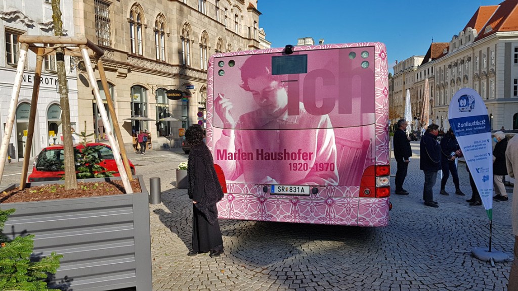 Ein aus Eigeninitiative entstandenes temporäres Kunstprojekt von Bernadette Huber im öffentlichen Raum in Steyr (OÖ), dem Lebensort von Marlen Haushofer von 1947 bis 1970. Der Marlen Haushofer-Kunstbus wird bis zum Herbst 2021 in Steyr auf Linie 5 unterwegs sein.