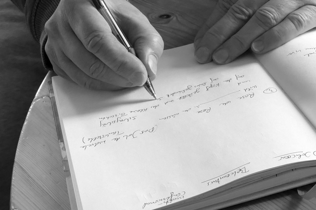 d.h. wir haben da so mehrere Runden – wir wohnen ziemlich am Stadtrand und sind sehr schnell in der “Prärie”, wo wir je uns nach Wetter bewegen können. Wir haben da meistens unser gemeinsames Textbuch dabei, wo wir unter dem Label 2fell seit inzwischen 22 Jahren zusammen Texte schreiben. Es gibt (½ Laufstunde entfernt) an einem Autobahnrasthof eine rote Metallsitzgruppe “mit Trucker-WC-Anschluss“. Es wäre sogar ein Café dabei, das aber seit Monaten geschlossen hat. Das klingt jetzt völlig unromantisch, aber diese Bank steht immer wunderbar in der Sonne und wir können uns gegenübersitzen, haben einen Tisch, können schreiben. Da sind letzten