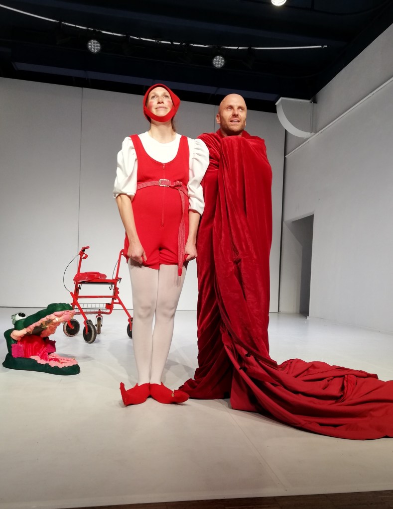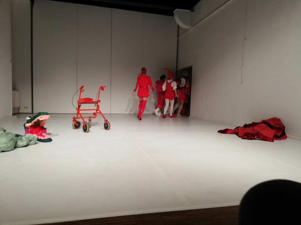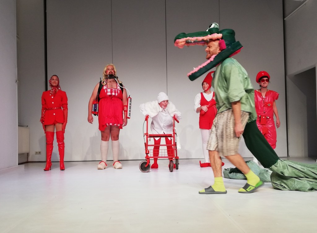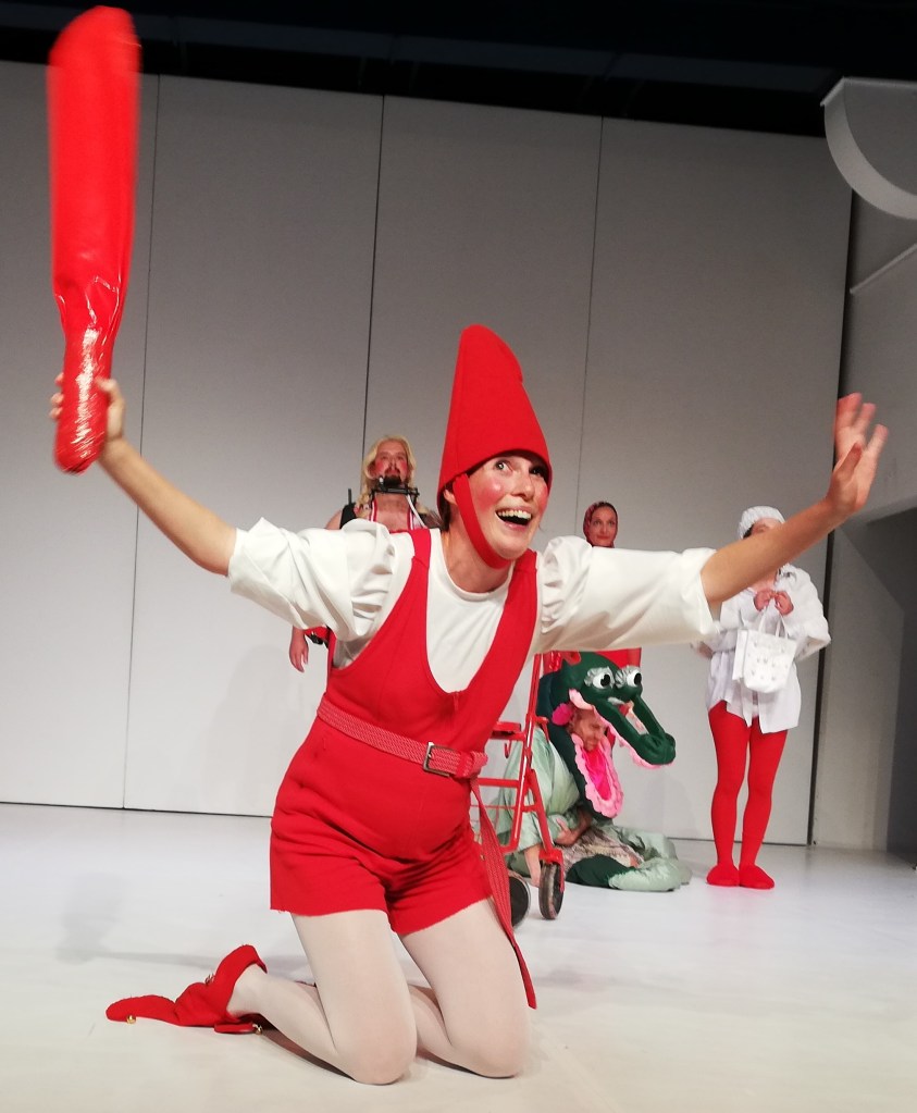 Doch dann stoppt die Musik. Der Reigen in Rot kommt zum Stehen. Das Krokodil stellt Fragen. Alle stellen Fragen. Dazwischen die Keule des Kasperls…
