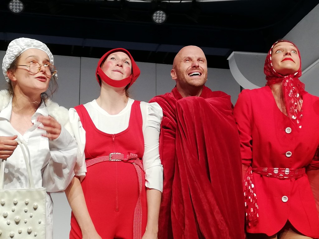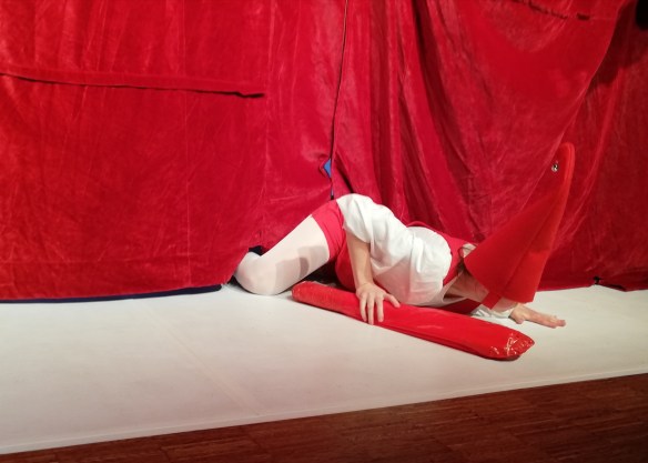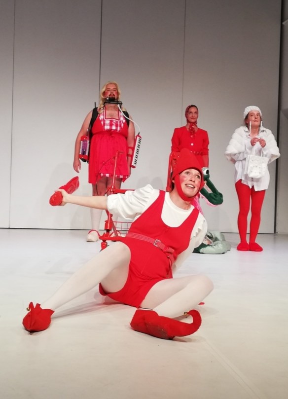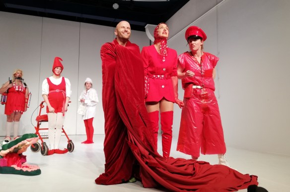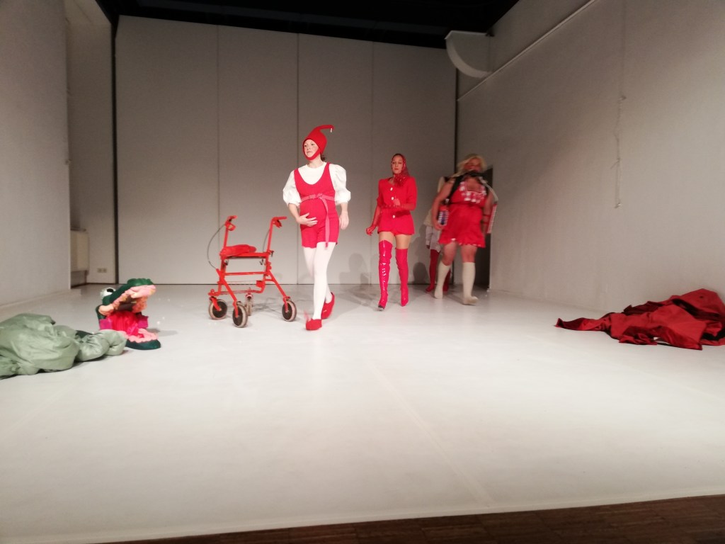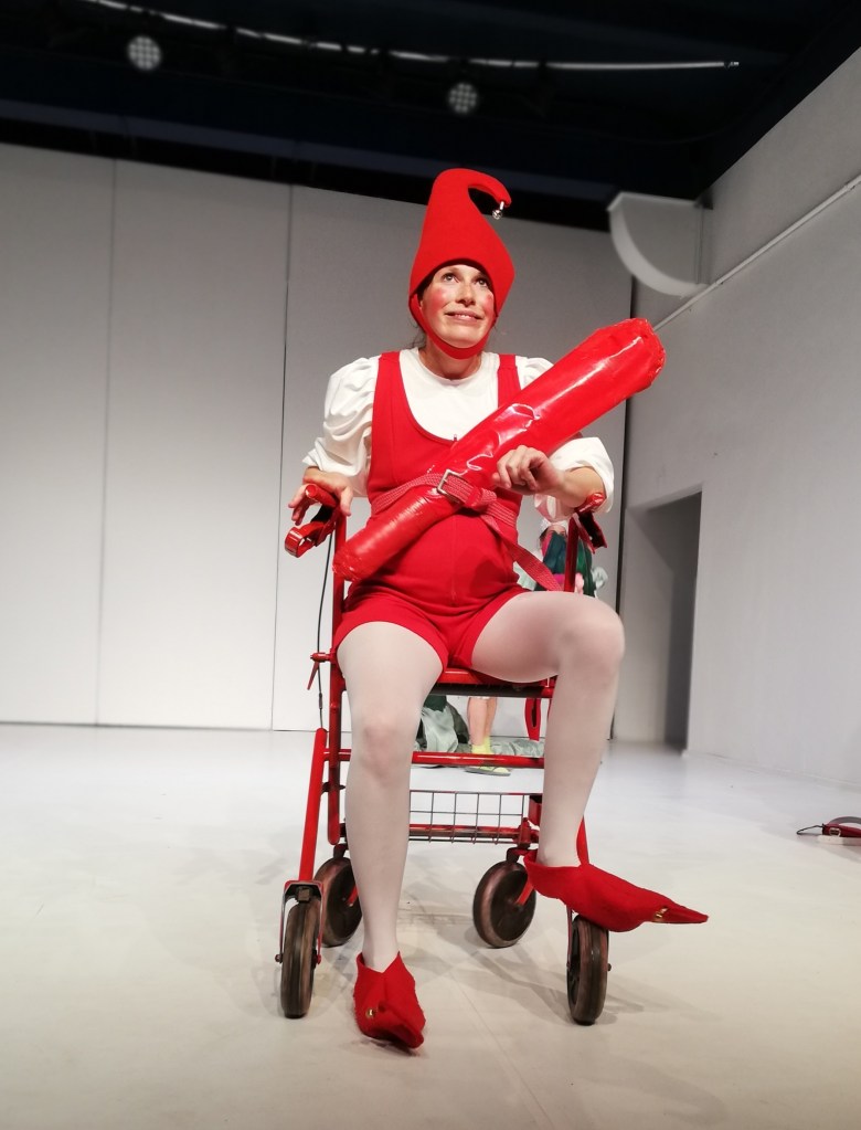 Doch dann stoppt die Musik. Der Reigen in Rot kommt zum Stehen. Das Krokodil stellt Fragen. Alle stellen Fragen. Dazwischen die Keule des Kasperls…