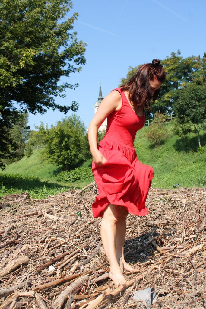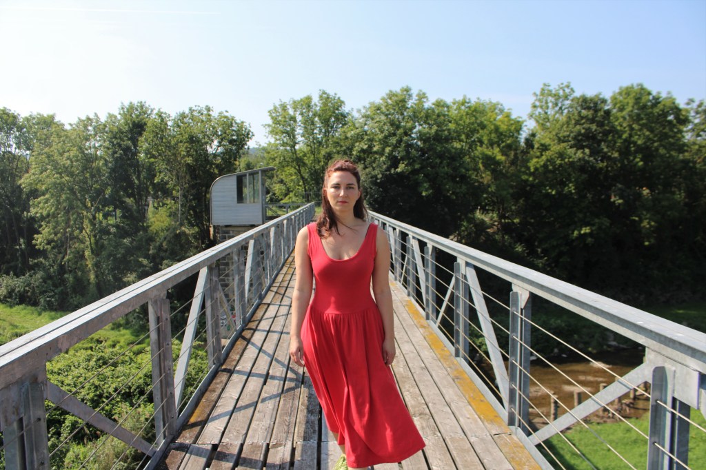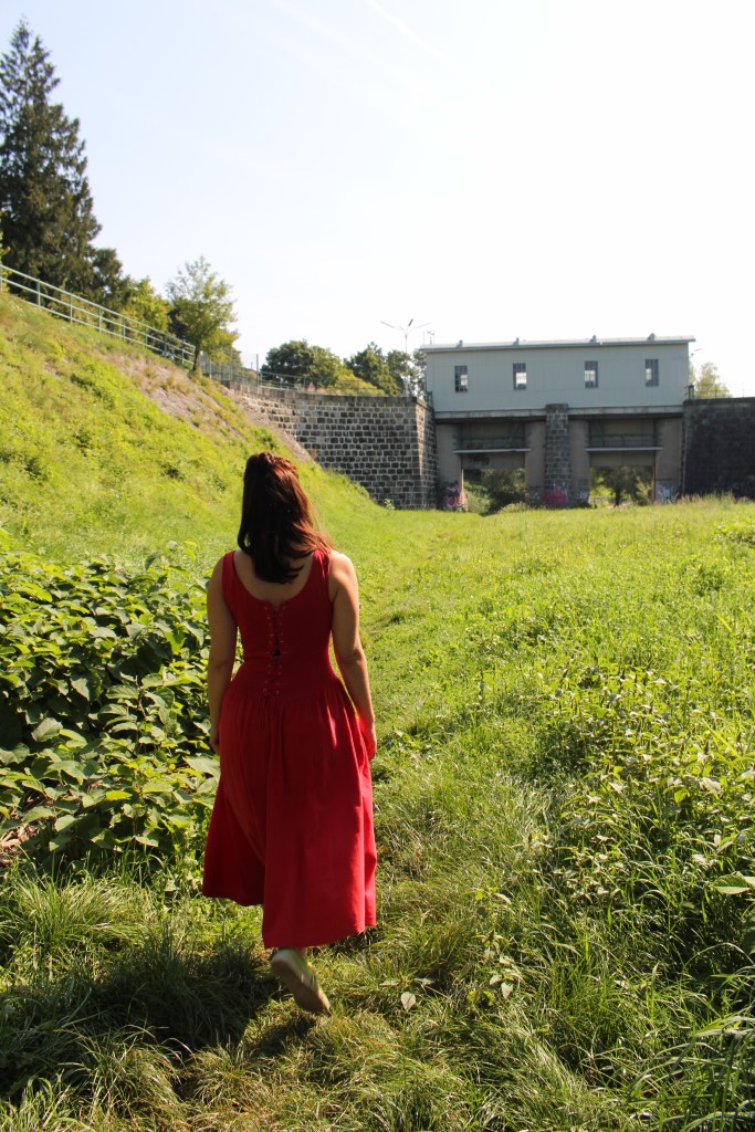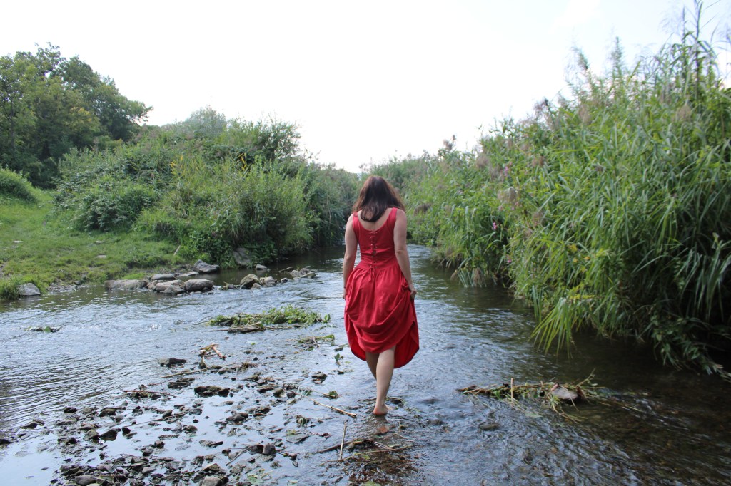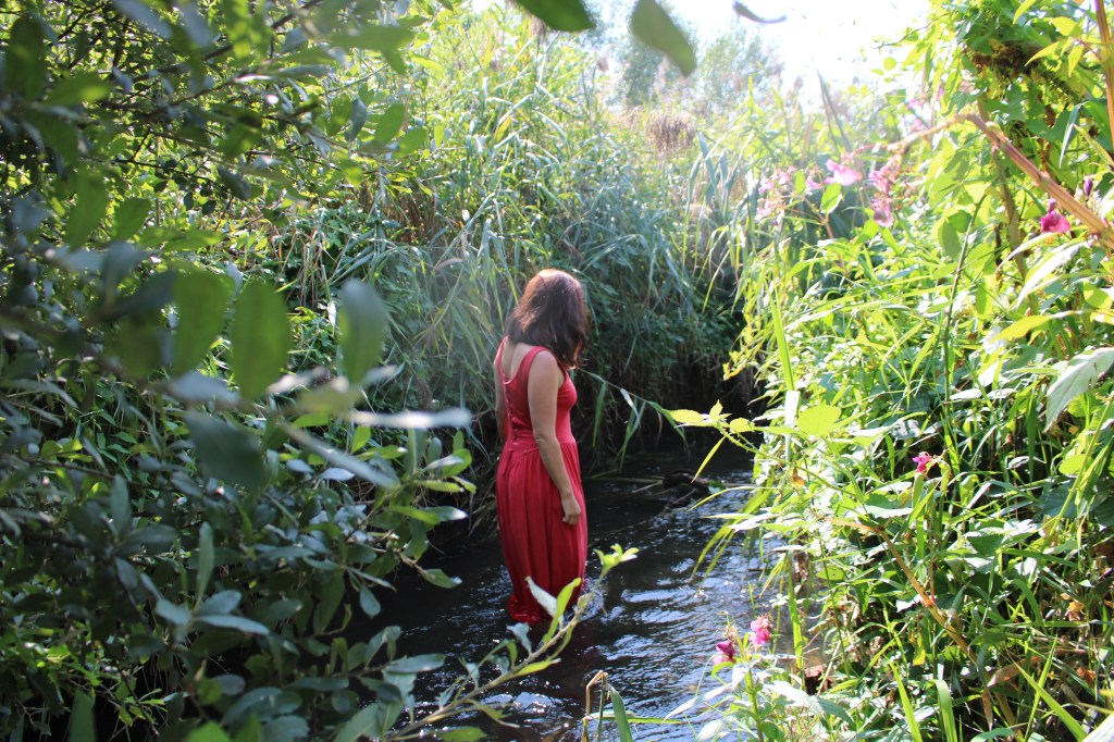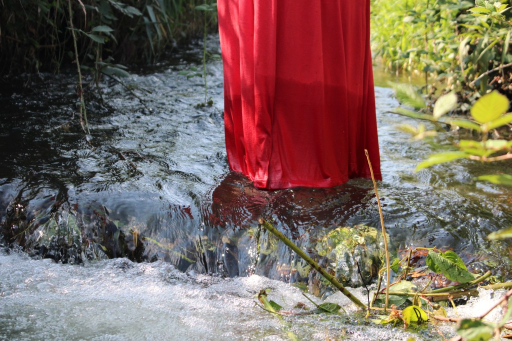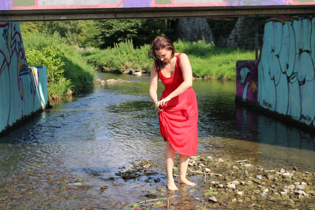 Das funktioniert ganz gut, und ich habe großen Spaß Plätze zu erkunden, die ich von dieser Gegend noch nicht kannte und den Ort in Verbindung mit der Undine Geschichte in Szene zu setzten. Selbstverständlich gehört für mich auch das „ins Wasser gehen“ am Schluss zu dem Märchen und so besuchen wir eine Stelle am Fluss, wo ich gerne durchs Wasser wate und weiß, dass ich dort tiefere Stellen finden werde.