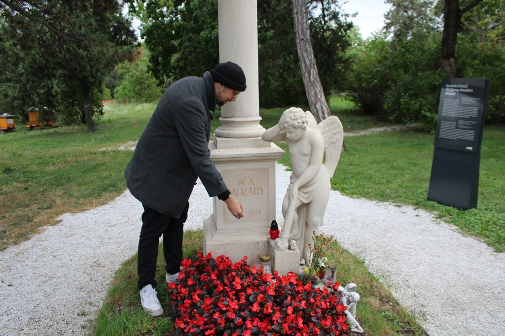 Heute. Einerseits wegen dem Interview hier am Sankt Marxer Friedhof, andererseits, weil ich vorher mit David Poglin, meinem Musikkollegen am Zentralfriedhof war. Wir haben ein paar organisatorische Sachen für mein Kabarettprogramm „Ehrengrab“ erledigt. Ich spiele nämlich das Programm am 22.10. in der Aufbahrungshalle. Außerdem werden wir auch Musik machen.