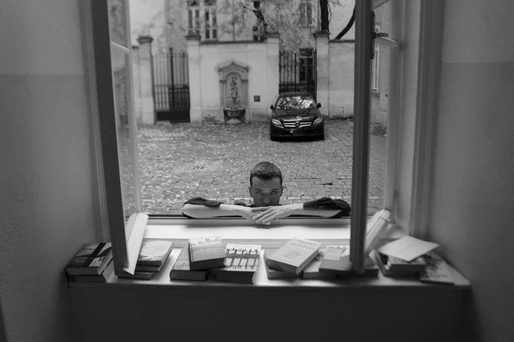 Ich verstehe, wie man ein düsteres Buch an diesem Ort schreiben kann (lacht). Der Ort hat eine klare Geometrie und gibt das Gefühl jetzt hier im Hof aufgrund der großen Fenster auch drinnen zu sein. Diese Ästhetik gefällt mir sehr gut.