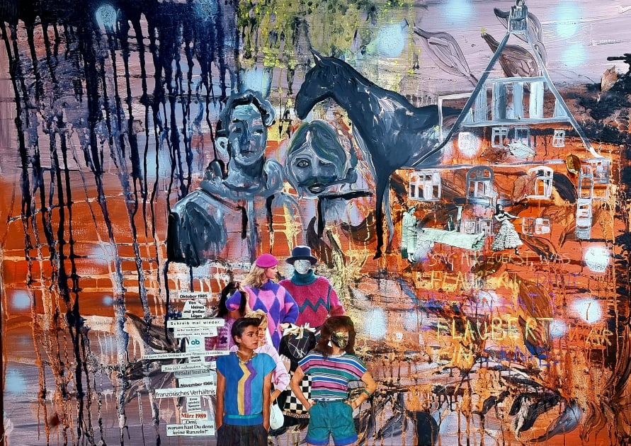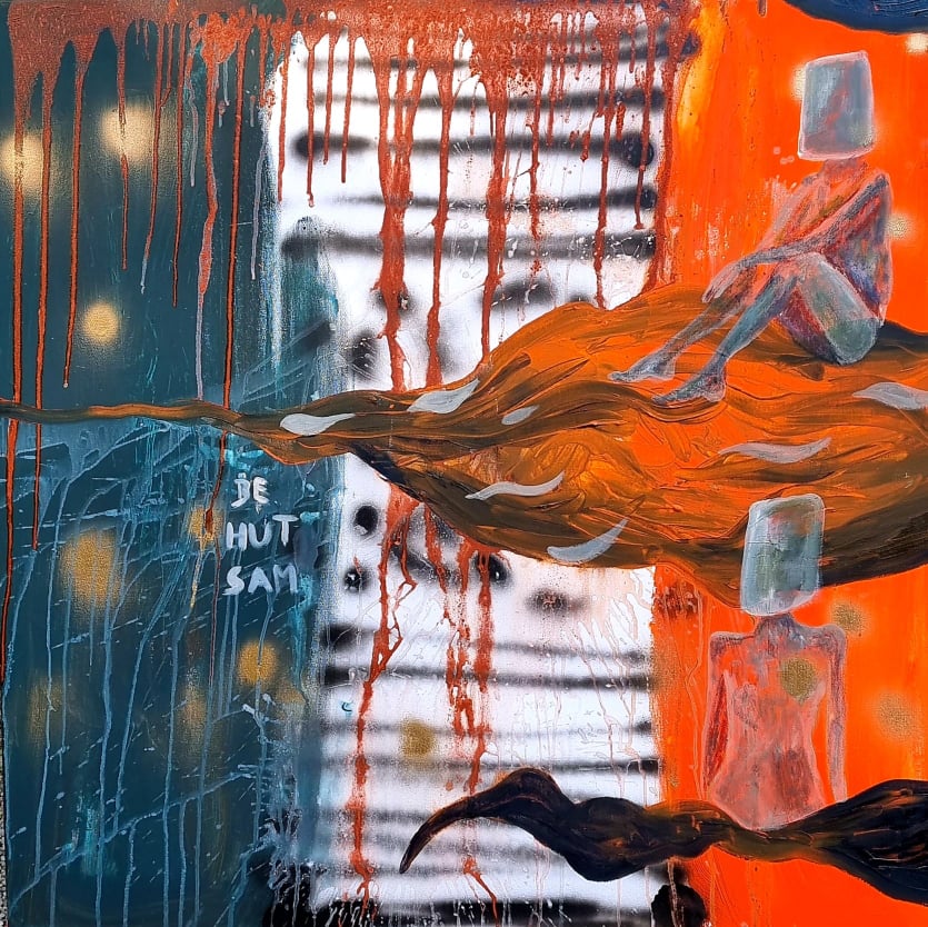 80×100 Öl, Acryl, Ölkreide, Spühfarbe, Collagenelement auf Leinwand
