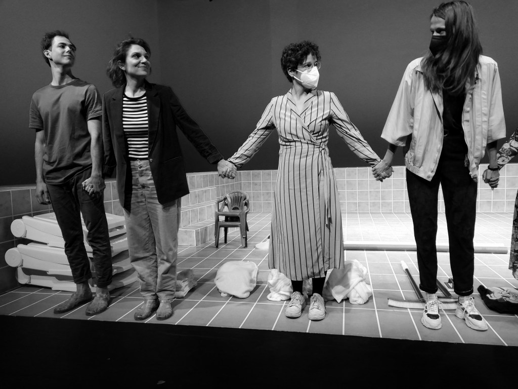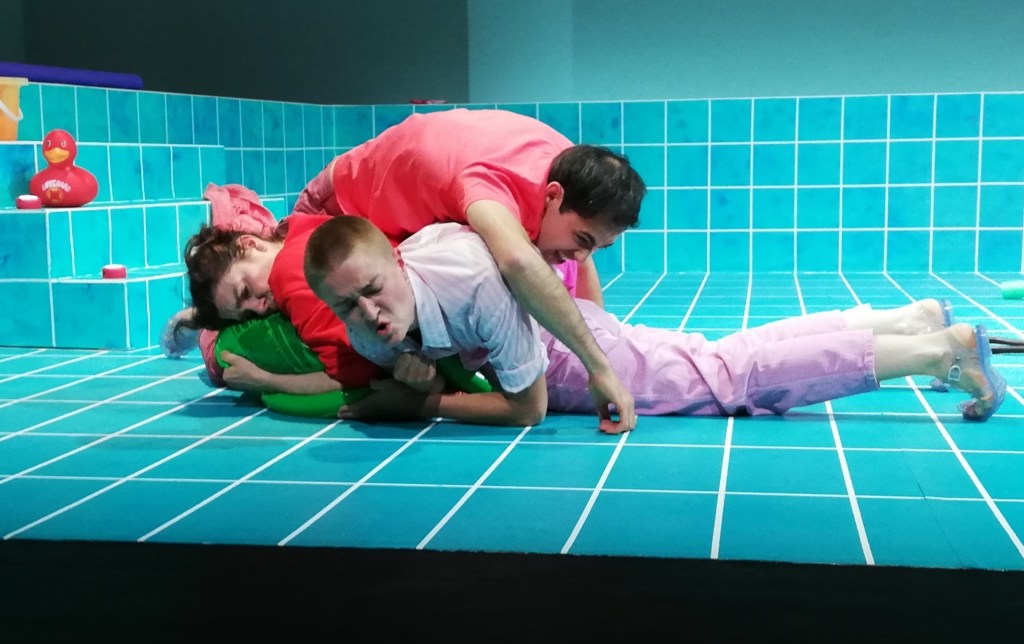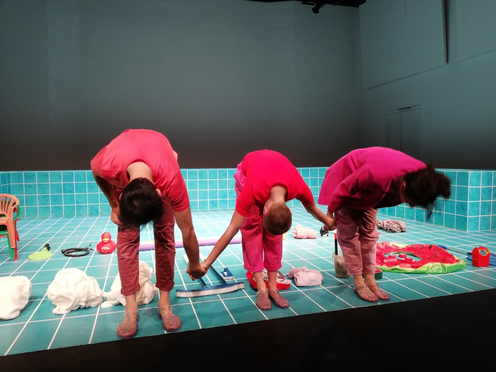 Die Spielpräsenz der hervorragenden Schauspieler*innen Birgit Stöger, Tamara Semzov und Thomas Kolle ist von Präzession in Sprache wie Körperausdruck geprägt und nimmt Bühnenbild und Requisiten in gleichsam unerträglicher Leichtigkeit des Seins mit ins dramatische dialogische Spiel und so wird im Swimming Pool die Ente, der Melonenschwimmreifen und die Seifenblasenmaschine zum Ausdruck der Ohnmacht im stockenden Erinnerungsimpuls. Diese patriarchale Macht der Dinge in das Spiel aufzunehmen und gleichsam in aller Dissonanz eines ohnmächtigen Lebens vielstimmig dramatisch klingen zu lassen, ist höchste Schauspielkunst.