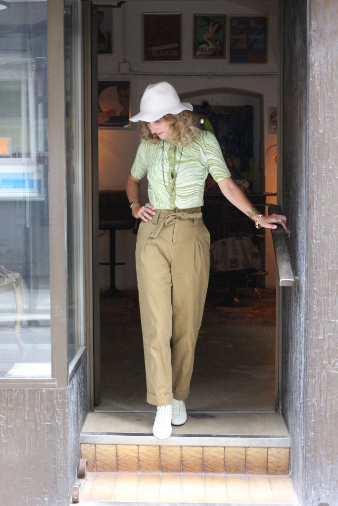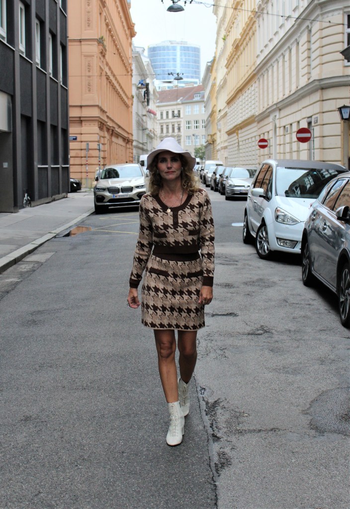 Psychodelische oder florale Muster in feinem Strick – und ein weißer Filzhut. Große Ohrringe, Ringe und Ketten in Bronze oder Gold.