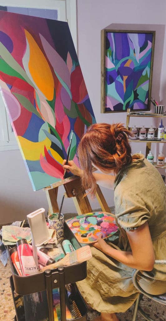 Durch meine Hündin bin ich zur Frühaufsteherin geworden. Um 7.30 Uhr gehe ich meistens mit ihr eine Morgenrunde. Danach gibt es ein kleines Frühstück auf der Veranda und eine Stunde später befinde ich mich meistens schon im Atelier. Die ersten Minuten nehme ich mir Zeit meine Mails zu checken und zu bearbeiten, danach arbeite ich an meiner neuen abstrakten Serie „PURE JOY“ weiter oder bereite einen Creative-Workshop für Kids vor.