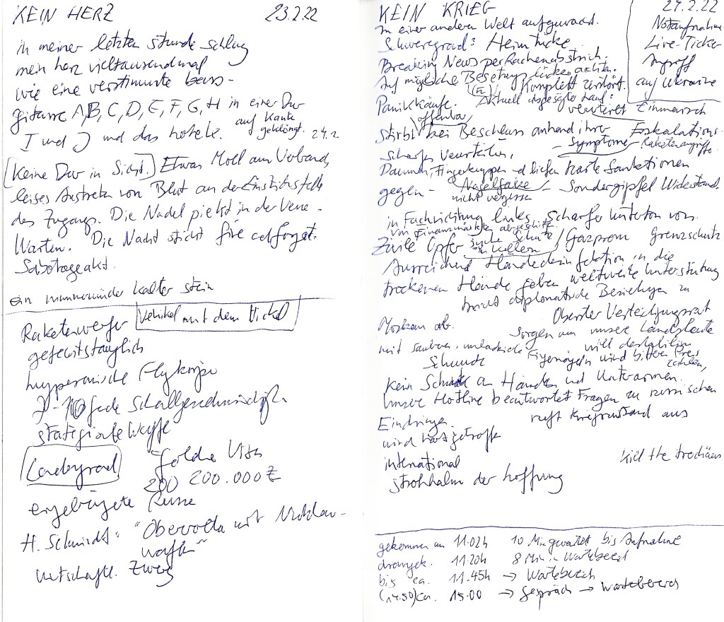Stattdessen entschloss ich mich, eine spezielle Doppelseite meiner Kladde einzucscannen, auf der ich zu Beginn des Ukrainekrieges auf die Ereignisse am Bildschirm reagiert habe. Dazu folgende Erklärung: