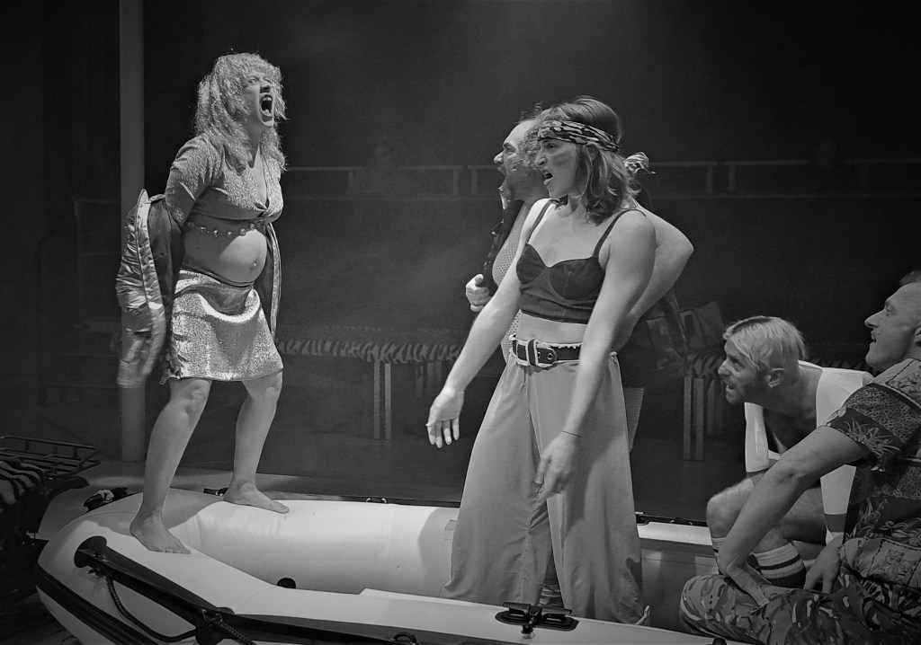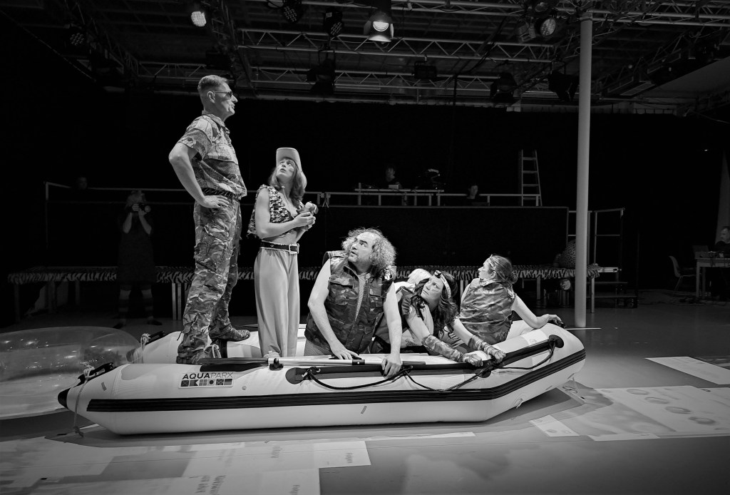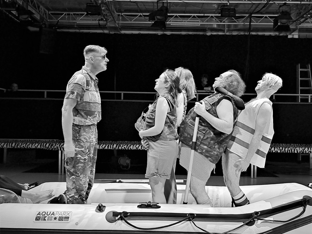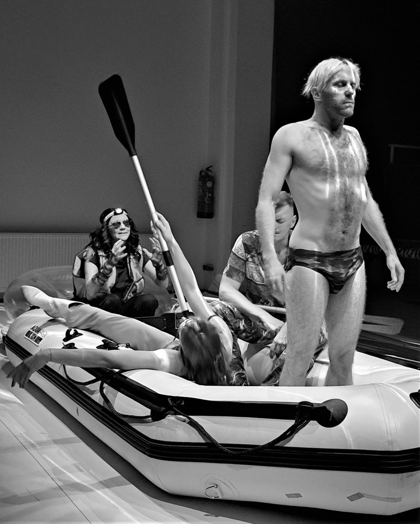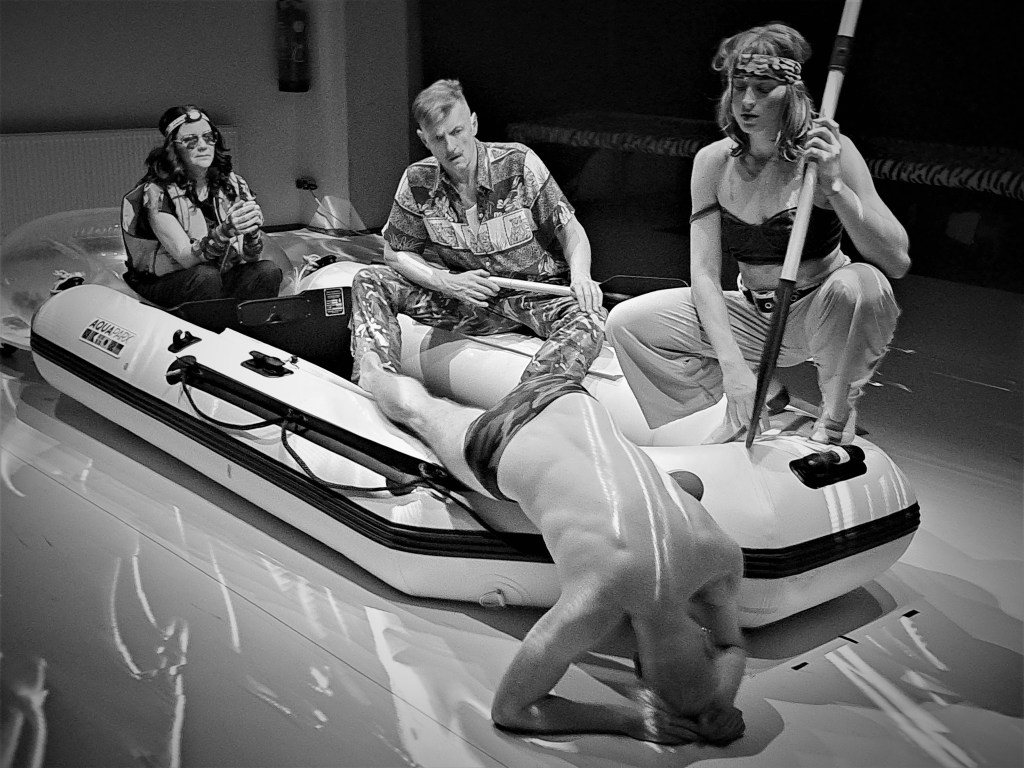 Die Ausnahmeschauspieler*innen Kristina Bangert, Yvonne Brandstetter, Sophie Resch, Kajetan Dick, Hubsi Kramar, Gerald Walsberger und Ernst Kurt Weigel, können alles und begeistern auf engstem Boot-Bühnenraum in einzigartiger individueller Spielkraft und Präsenz, der Szenen Koordination im atemlosen Tempo wie einem unglaublichen Balancegefühl (Schlauchboot!).