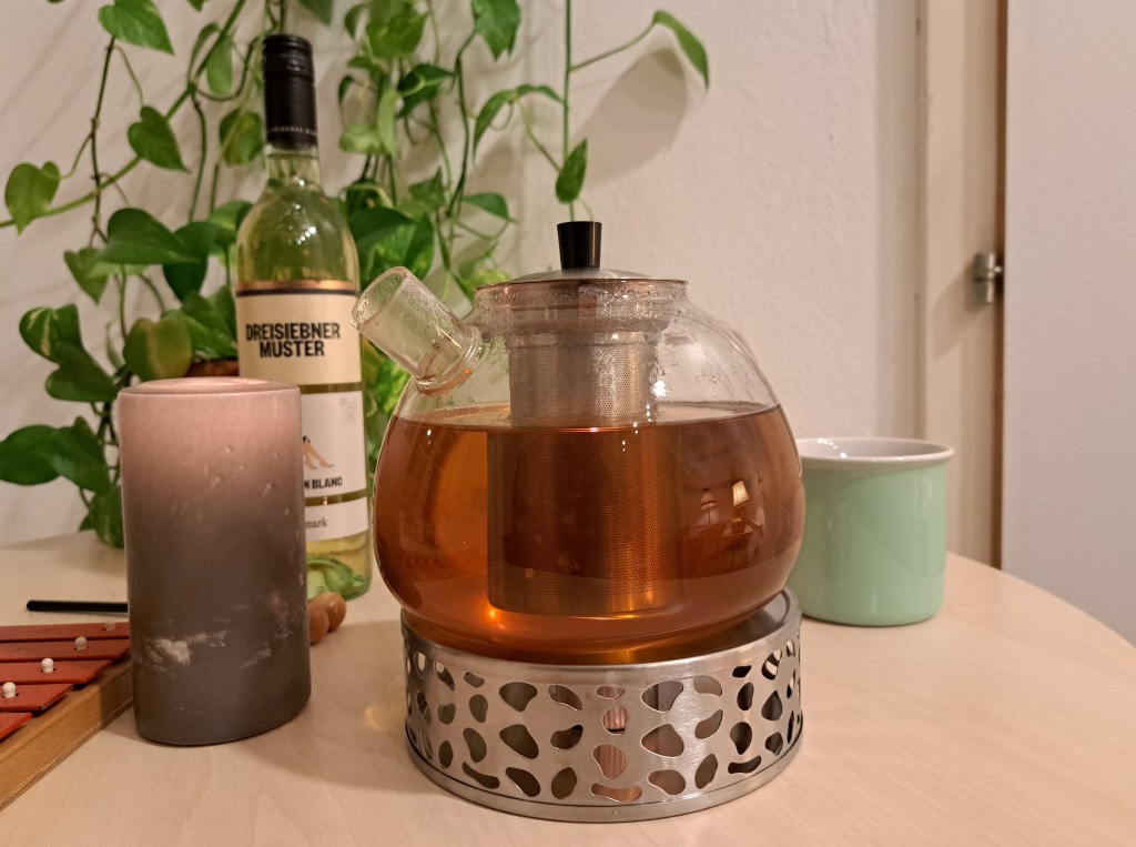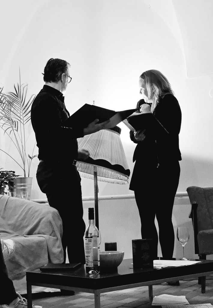 Da ist das Wohnzimmer. Die leeren Gläser. Die Bücher. Die Stehlampe. Der Wein. Der Tee. Eine Frau. Zwei Männer.