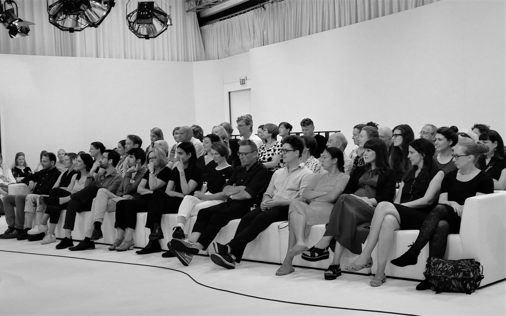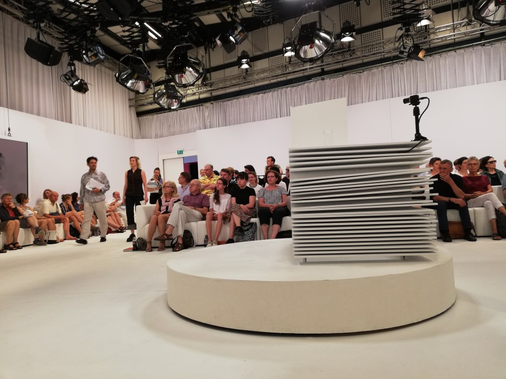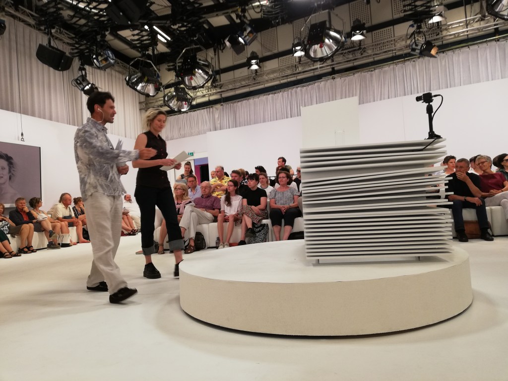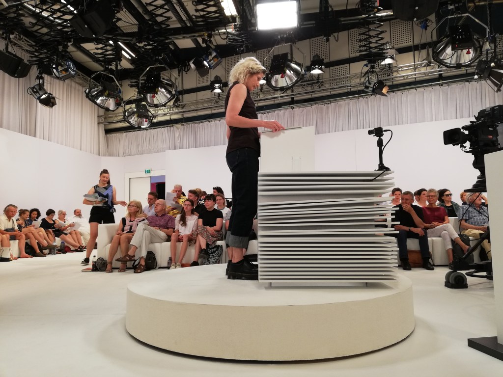 Gleich zu Beginn trat eine Erwartungshaltung einiger Jurymitglieder hervor, nämlich, dass ich bei der Lesung performativ(er) agieren würde. (Ich nehme an wegen meines Hintergrunds als Tänzerin/Choreografin). Ich fand das ganz unverständlich, denn der Textauszug war ja offensichtlich für eine Wasserglas-Lesung gedacht. Hätte ich stimmlich/körperlich „performen“ wollen, wäre der Text anders strukturiert gewesen. Die anschließenden Interpretationen des Auszugs gingen für mich zum Teil ins Leere. Was mich geärgert hat, war die Unterstellung, der Text sei sprachlich nicht durchgearbeitet. Ich glaube, die Juryleute hatten da einen Text vor sich liegen, den sie einfach nicht einordnen konnten. Etwas überspitzt gesagt und vielleicht nicht auf alle Jurymitglieder zutreffend: Die formal/inhaltlichen Aspekte waren ihnen so fremd, dass sie nur den Kopf schütteln konnten. Ich empfand das als Schwäche seitens der Jury, denn der Text steht nicht im luftleeren Raum und zeigt durchaus Querverbindungen zu künstlerischen, philosophischen und eben auch literarischen Strömungen. Als ich von Hildegard Keller aufgefordert wurde, etwas zur Diskussion beizusteuern, war ich froh. Das gab mir die Möglichkeit, kurz über meine kompositorische Herangehensweise zu sprechen.