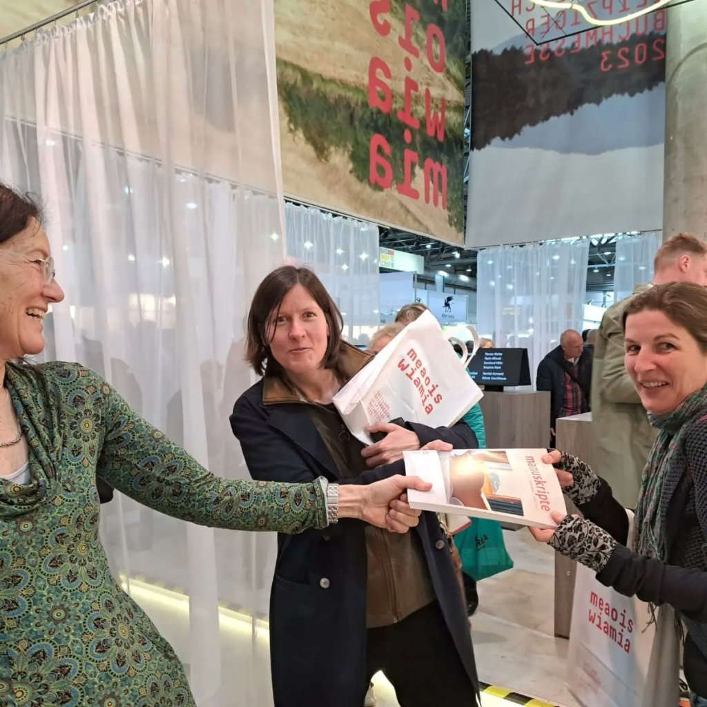 Ich hoffe, dass auch die manuskripte ihre Spuren hinterlassen haben. Mit dem manuskripte-Poesieautomaten „Liebe aus Österreich“, der im Herzen des österreichischen Standes für 50 Cent 14 Liebesgedichte aus Österreich ausgab, und den Tausenden Freiexemplaren der Ausgabe 239 mit dem ebenso ironischen wie ikonischen Cover von Anna Jermoalewa, stehen die Chancen dafür, vermute ich, gar nicht einmal so schlecht. Sowohl Gedichte als auch Hefte gingen jedenfalls weg wie die warmen Buchteln aus dem Österreich-Café, vom Bio-Weißwein (Weingut Nievoll), den wir zu besonderen Gelegenheiten ausschenkten, ganz zu schweigen.