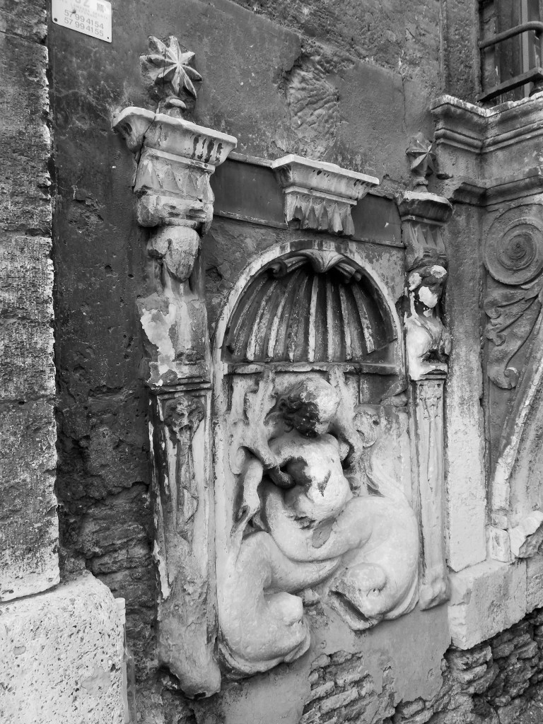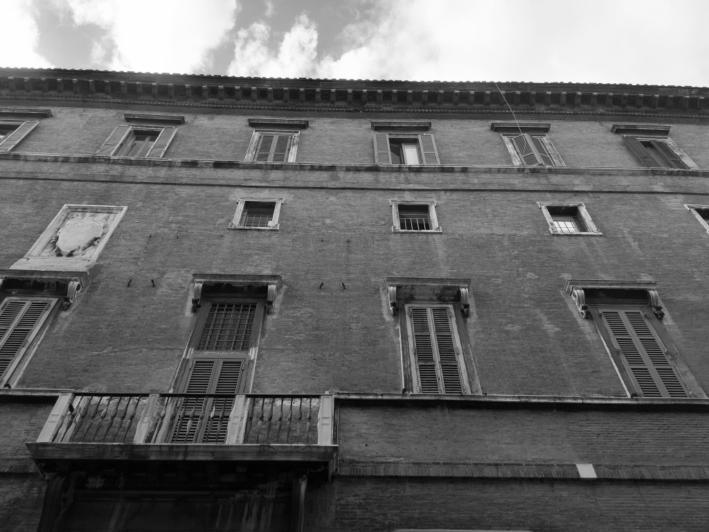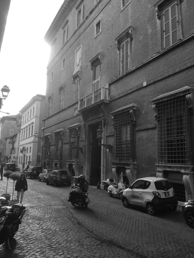 „Das regelmäßige, vom Alter geschwärzte, kahle und massive Haus machte ihn etwas beklommen….Die Fassade, gegen die Straße zu ungeheuer breit und viereckig, bestand aus drei Stockwerken; das erste Stockwerk war sehr hoch, sehr vornehm. Statt jeden Schmucks ruhten die hohen, wohl aus Furcht vor einer Belagerung mit ungeheuren, vorspringenden Gittern versehenen Fenster des Erdgeschosses auf großen Konsolen…“ Rom, Emil Zola