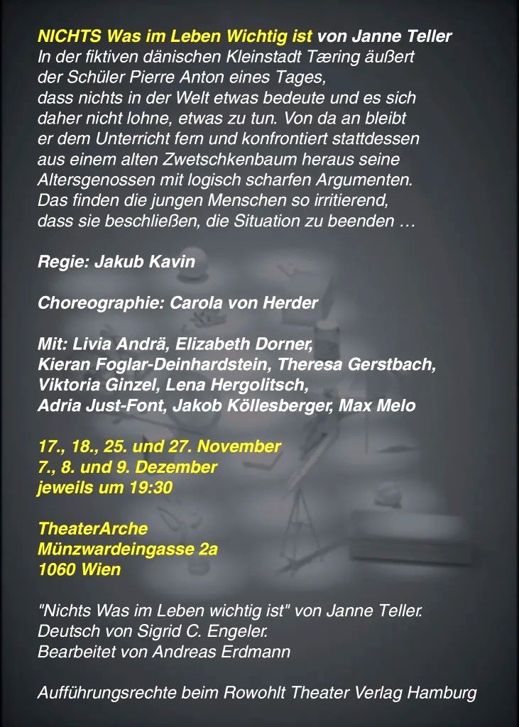 Mehr Info:https://www.theaterarche.at/nichts-was-im-leben-wichtig-ist/