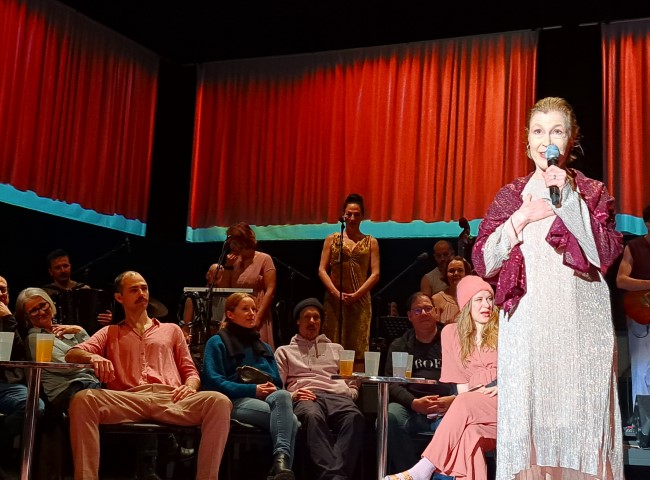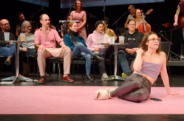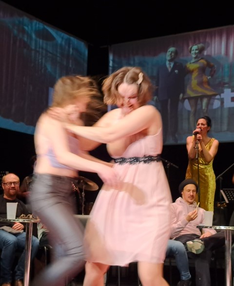 Der geniale Kunstgriff von Regie/Dramaturgie/Bühnenbild beginnt schon mit dem äußerst gelungenen wie durchdachten Bühnensetting und Intro, welches in seiner Salonatmosphäre – spitze auch die Wandbildkarikaturen – das Publikum in die Mitte des Stücks im wahrsten Sinne des Wortes setzt und damit diese „vierte“ Wand (Bühne-Publikum) wunderbar auflöst. Und dies gelingt und kommt an. Das Publikum geht bis zum Finale mit „take this waltz“ – toll die musikalische Performance, die Akzente setzt und Inszenierung und Spiel mitträgt – großartig mit.