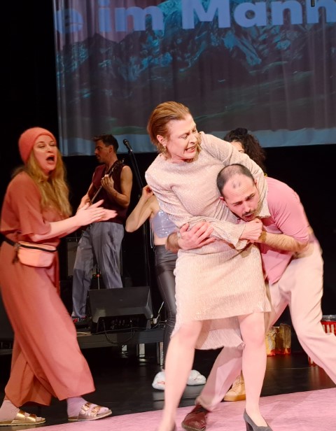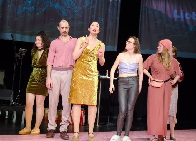 Das Publikum betritt den Saal, der zum Salon geworden ist, zum Salon D`Amour, hier nehmen Schauspielerinnen Bestellungen auf und servieren Schnaps und Bier an die Tische. An den Bühnenwänden Bilder der Liebe zu Land und Leuten also zu den Normalen…