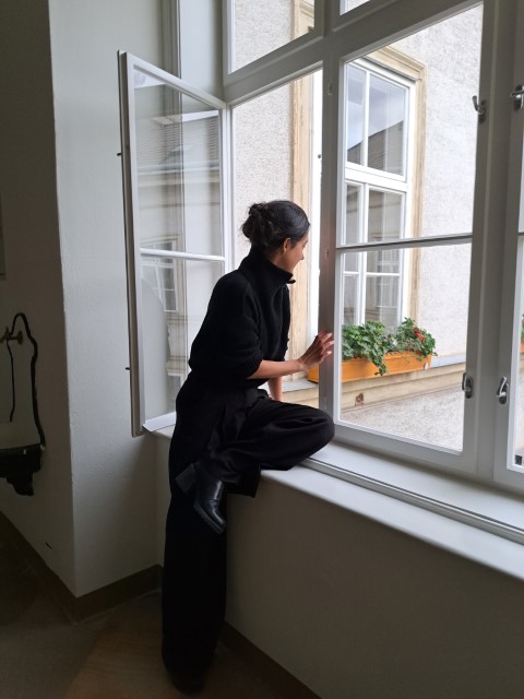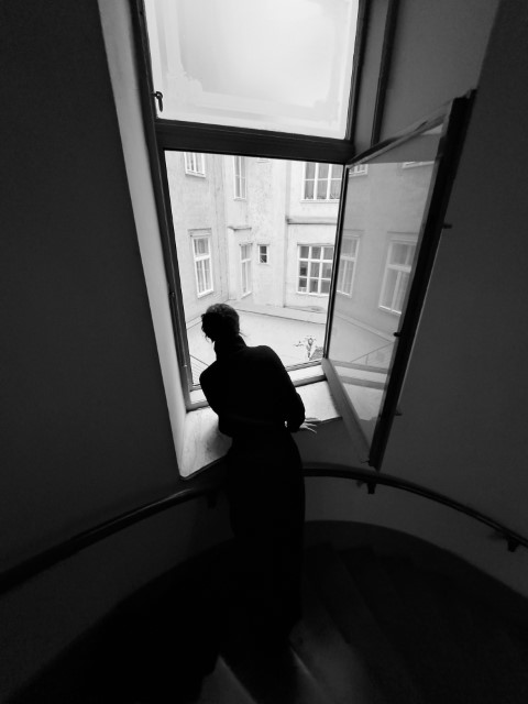 Hinaus kann nur, kursiv, die Geschichte führen, aber auch die bricht ab, es erscheinen nur noch Splitter, Wortscherben, bis sie verstummt. Ivan ist ein Verbündeter und ist es nicht. Ich denke an Iwan Karamasow, finde ihn aber nicht so recht wieder in Ivan. Ich lese, später, dass sich der Name Ivan von Johannes ableitet, aus dem Hebräischen übersetzbar mit „der Herr ist gnädig“, lese: „Somit ist der Name [Johannes] als Dankname zu verstehen“. Den entrückten Danknamen finde ich wieder im Ivan des Romans. Die Liebe zu Ivan ist eine leidenschaftliche und zugleich religiöse Liebe. Doch die Frau im Roman scheitert an ihr, wie Dostojewskis Iwan an der Religion scheitert. Der Dank verheißt keine Rettung – weder in der Liebe noch in der Religion. Nah war nur der Fremde. Der Vierte, von dem sich nicht reden lässt. Oder vielleicht sogar nur sein Mantel. Nähe fühlt man, hier, in der Ungargasse, nur im geöffneten Fenster, im Fensterrahmen, auf der Fensterbank, „vor einem Fenster werden wir stehen, lass mich ausreden!“, wo sich, unvermittelt, spürbar, weder klar trennbar, noch vereinbar, Innen und Außen berühren dürfen. Das konzentrierte, davonsehnende Eigene und die gewaltige, heranbrandende Ferne. Und kein Drittes. „Ich: Doch. Eine Ausnahme.“