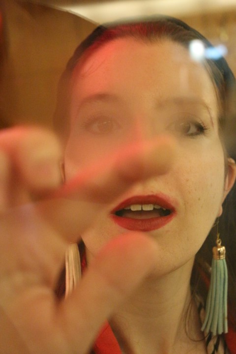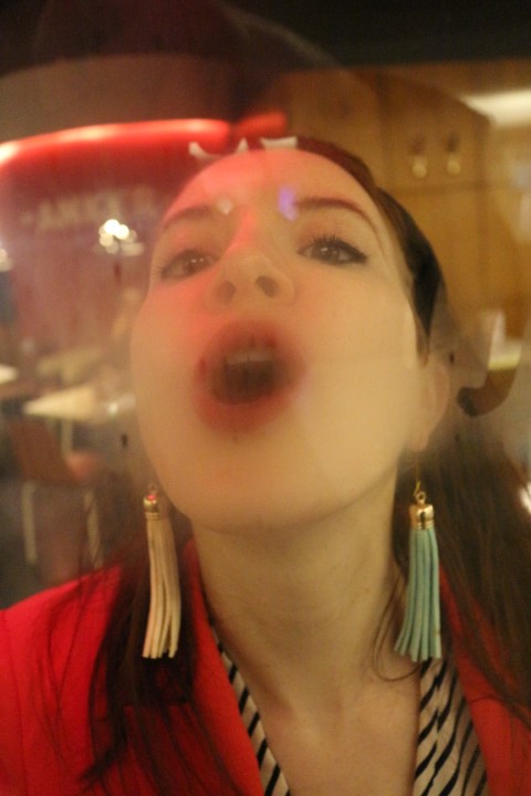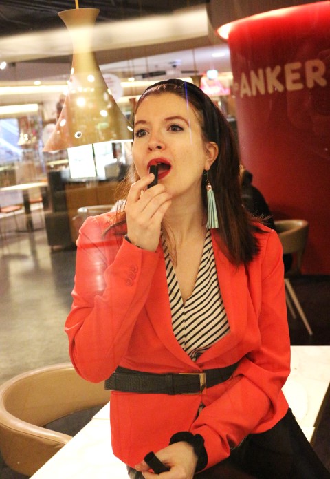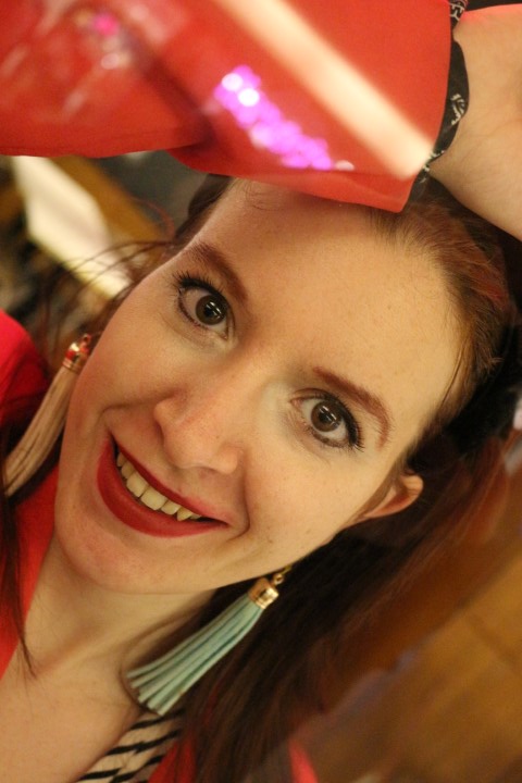 Bei der Vorbereitung zum Styling musste ich vor allem an die großen Brillen, die Haarreifen und riesen Schulterpölster denken. Ich denke, ich habe mit meinem Outfit das Beste aus meinem Kleiderschrank geholt, dass er in Sachen 80er zu bieten hatte. Enge schwarze Lederhosen, eine Bluse mit Gürtel und einen knallroten Blazer mit Schulterpölstern. Als Acessoire natürlich einen Haarreifen und große Ohrringe. Sehr große Ohrringe. Den roten Lippenstift habe ich dick aufgetragen. Das mache ich übrigens auch privat sehr oft, daher ist das für mich nichts speziell ungewöhnlich extravagantes.