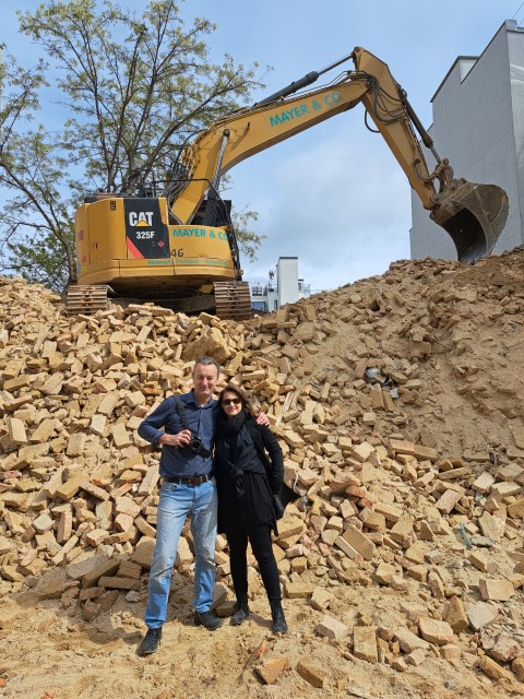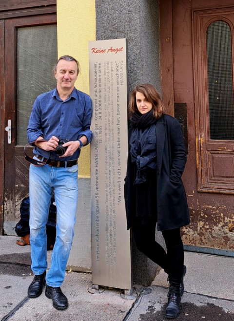Constanze Hojsa und Walter Pobaschnig vor der Gedenkstele „Keine Angst!“ _ Wohnhaus von Hansi Lang in Wien/Hernals