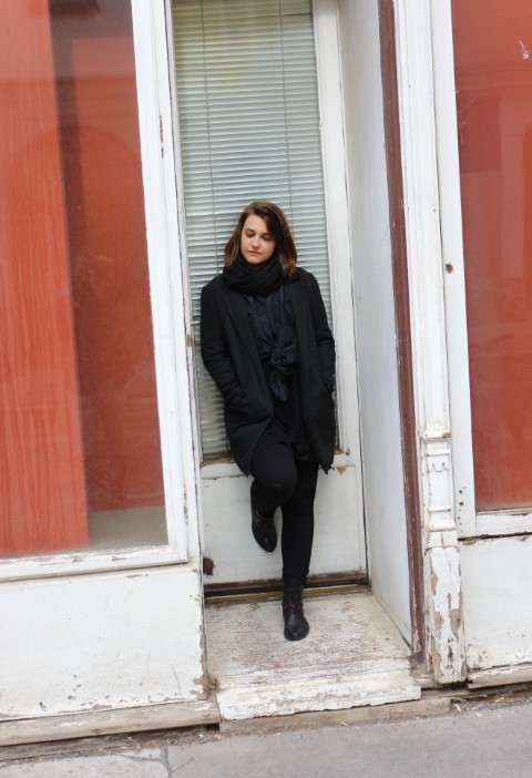 Ich habe mir das Hotel angeschaut, dass du für das Fotoshooting vorgeschlagen hast. Welche Zeitepoche, welcher Baustil, etc. Ich dachte an Kafka, die Zeit, in der er gelebt hat. Jugendstil und den Übergang in die Moderne. Krieg. Trauer. Und habe schwarze Kleidung gewählt. Das war für mich klar. Schlicht, da im Raum rein stilistisch viel passiert und ich möchte keine Ablenkung sein; ich finde das Hotel sehr schön. Mein Stil aber trotzdem eher klassisch und zeitlos, so wie seine Bücher. Meine Verbindung zum Raum sind die goldenen, leicht pompösen Ohrringe. Schuhe und Hose mit einem leicht männlichen Schnitt, aber immerhin Lackschuhe, um eine Verbindung mit den Ohrringen zu bilden. Und Oberteil ganz schlicht, aber mit Schulterpolster, um mehr Ecken in meinem Körper zu schaffen, die nochmals mit der Umgebung zusammenkommen. Der Raum ist ja sehr viereckig. Und in Gedanken Überlegungen wie “wie kann ich ein Käfer sein”, “wie soll ich mich als Käfer fühlen, bewegen”. Und als nächstes an Kafkas Anwesenheit gedacht. Ich bin aber gerade von düsteren Gefühlen und Gedanken so weit weg, dass ich dann eher mir gedacht habe, “ich werde einfach die jetzige Phoebe in dem Raum sein und somit Kafkas Dunkelheit in Freude verwandeln”. Und das war für mich “Die Verwandlung”.