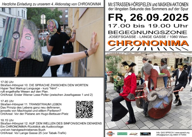 Die performativen Playback-Hörspiel-Aktionen dauern jeweils ca. 10 Minuten und werden vom Künstlerduo Blumenau und Kreuz durchgeführt (Texte, Sound-Art und Performance). Dazwischen wird sich die Audiosänfte in Bewegung setzen. Wer will, zieht mit. Nähere Infos zum Projekt und zu den Hörspielen: https://www.sprech.org/pages_spr/chrononima_aktionstag_4v4.html
