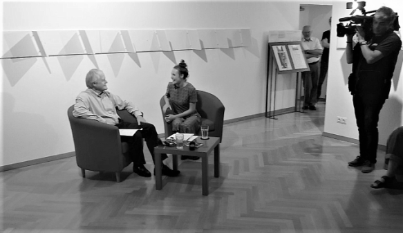 Szenische Ausstellungseröffnung mit Heinz Bachmann und Isabella Jeschke, Schauspielerin _ 25.6.2016 Musilmuseum Klagenfurt Heinz und Sheila Bachmann (sitzend außen) Wien Juni 2016, Probe zur szenischen Ausstellungseröffnung „Ingeborg, wie ich meine Schwester in Rom sah – Fotografien Heinz Bachmann, 1962“ Musilhaus Klagenfurt/2016 _ mit Isabella Jeschke, Schauspielerin, und Walter Pobaschnig (Idee, Regie).