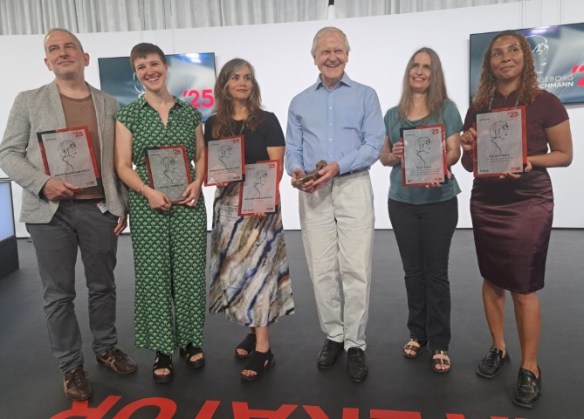 Heinz Bachmann mit den Preisträger:innen der Tage deutschsprachiger Literatur in Klagenfurt _ Bachmannpreis 2025 für Natascha Gangl