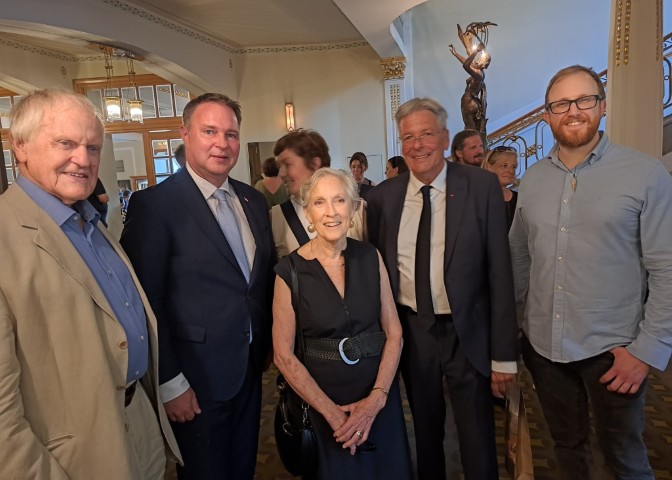 Am Foto von links: Dr.Heinz Bachmann, Bruder von Ingeborg Bachmann, Andreas Babler, Vizekanzler der Republik Österreich, Sheila Bachmann, Frau von Heinz Bachmann, Dr.Peter Kaiser, Landeshauptmann von Kärnten, Christoph Bachmann, Sohn von Heinz und Sheela Bachmann.