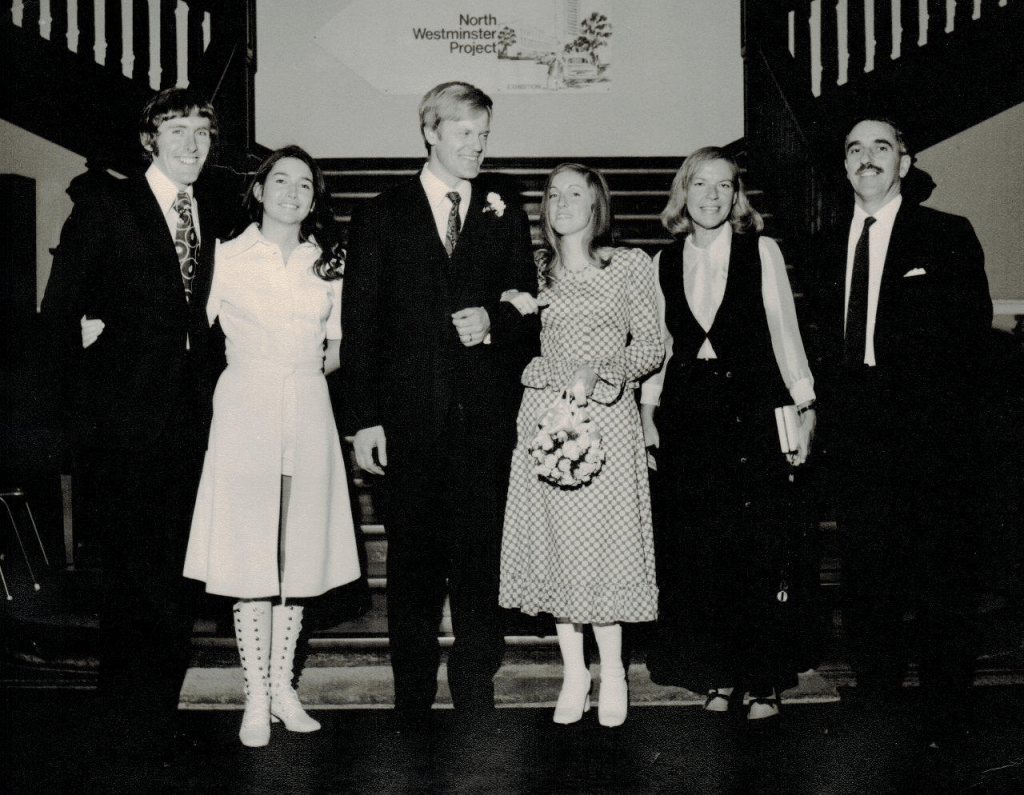 Heinz und Sheila Bachmann (Mitte) _ Hochzeit 7. August 1971 in London_ rechts neben Sheila Bachmann Ingeborg Bachmann. Die Trauzeugen waren Graham und Sue Tarry. (Familienarchiv Bachmann)