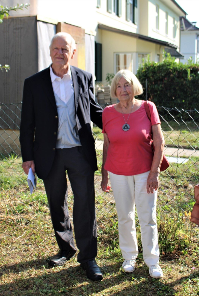 Heinz Bachmann und Isolde Moser (geb.Bachmann), Schwester von Heinz und Ingeborg Bachmann _ im Garten des Elternhauses in der Henselstr./Klagenfurt bei der Übergabe an die Stadt Klagenfurt/Land Kärnten_September 2021 _