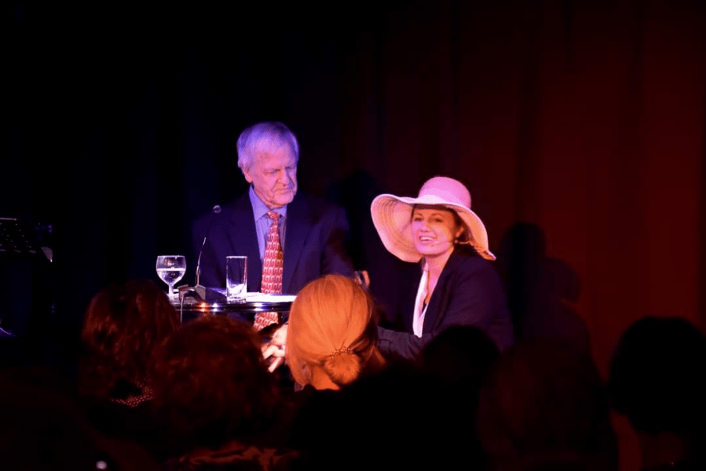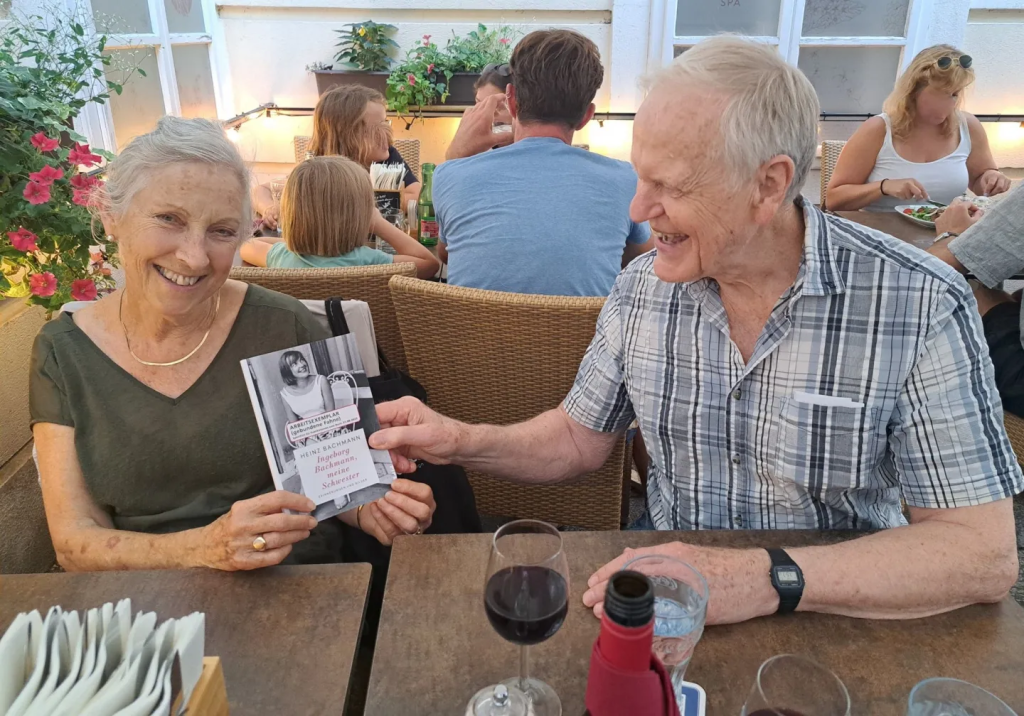Heinz und Sheila Bachmann _ beim Heurigen in Wien, Juli 2023 _ mit dem frisch gedrucktem Buch _ „Ingeborg Bachmann, meine Schwester“ Heinz Bachmann/Piper Verlag _8/2023