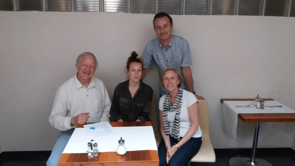 Mithu Melanie Sanyal, Schriftstellerin, Bachmannpreis Jurorin mit Familie Bachmann. Heinz Bachmann, Bruder von Ingeborg Bachmann, mit Gattin Sheila Bachmann (Heirat 1971 London, Ingeborg Bachmann war Trauzeugin) und Sohn Christof Bachmann.