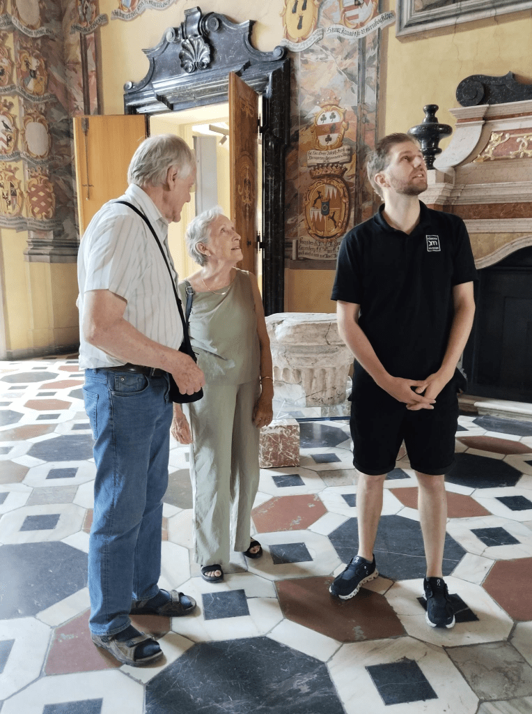 Sheila und Heinz Bachmann in der Ursulinenschule in Klagenfurt, die Ingeborg Bachmann besuchte. _ Foto _ Sommer 2025, folgendes…joyfully back to schoolIm Wappensaal _ Landhaus Klagenfurt Erfrischung im Landhaushof Klagenfurt