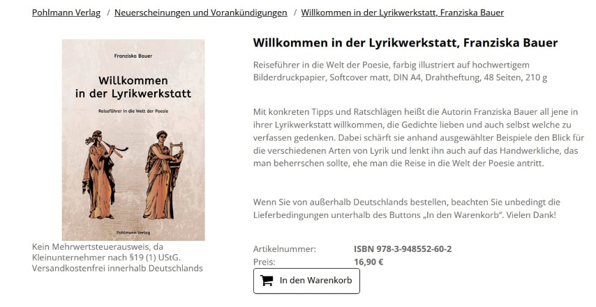 Willkommen in der Lyrikwerkstatt. Reiseführer in die Welt der Poesie. Franziska Bauer. Pohlmann Verlag.