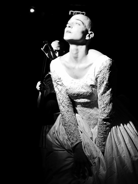 Als das Licht angeht, ist eine Frau nackt am Boden kauernd zu sehen. Schnell und bestimmt finden die Männer nun ihren Platz und beobachten diese mit Arroganz, die ihre Unsicherheit jäh verschlingt. Jetzt finden sie ihre Sprache wieder und diese ist ein Messer und ein Hammer. Kalt und tödlich. Und so sind auch ihre Fragen an die angeklagte Frau. Sie versucht zu antworten. Doch die Fragen sind nicht Fragen sondern bloß gebrüllte Aussagen, die es unter fordernden Blicken zu bestätigen gilt. Es gibt keine Auswahl der Antworten. Keine Wahl. Das ist kein Gericht sondern ein Tribunal. Sie ist ein Objekt. Umringt von entfesselter entblößter Machtphantasie. Doch angeklagt sind nicht diese, nein, sie ist es, die es zu überführen, zu verbrennen gilt. Wird es gelingen? Gelingen wie damals in Rouen 1430? Johanna. Eine Passion. Eine zeitlose Passion….